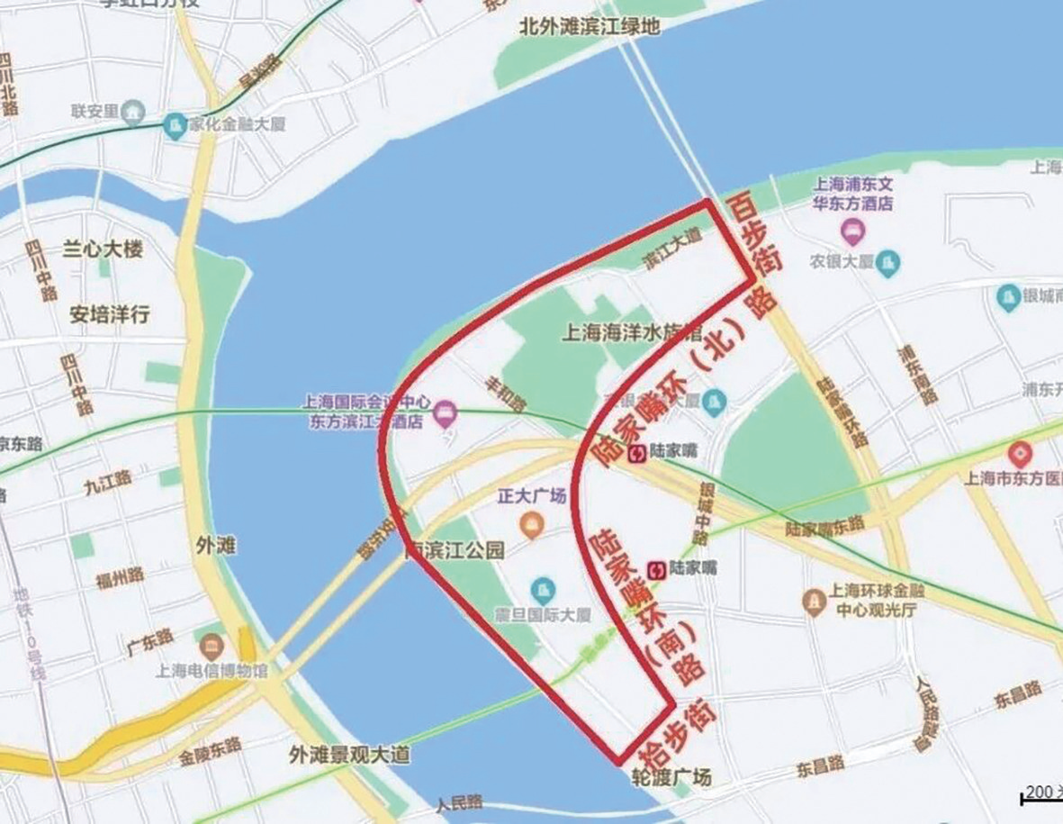 2.浦东地区:沿百步街—陆家嘴环(北)路—陆家嘴环(南)路—拾步街及黄浦江边所围合区域内的道路(不含上述道路),禁止机动车通行。