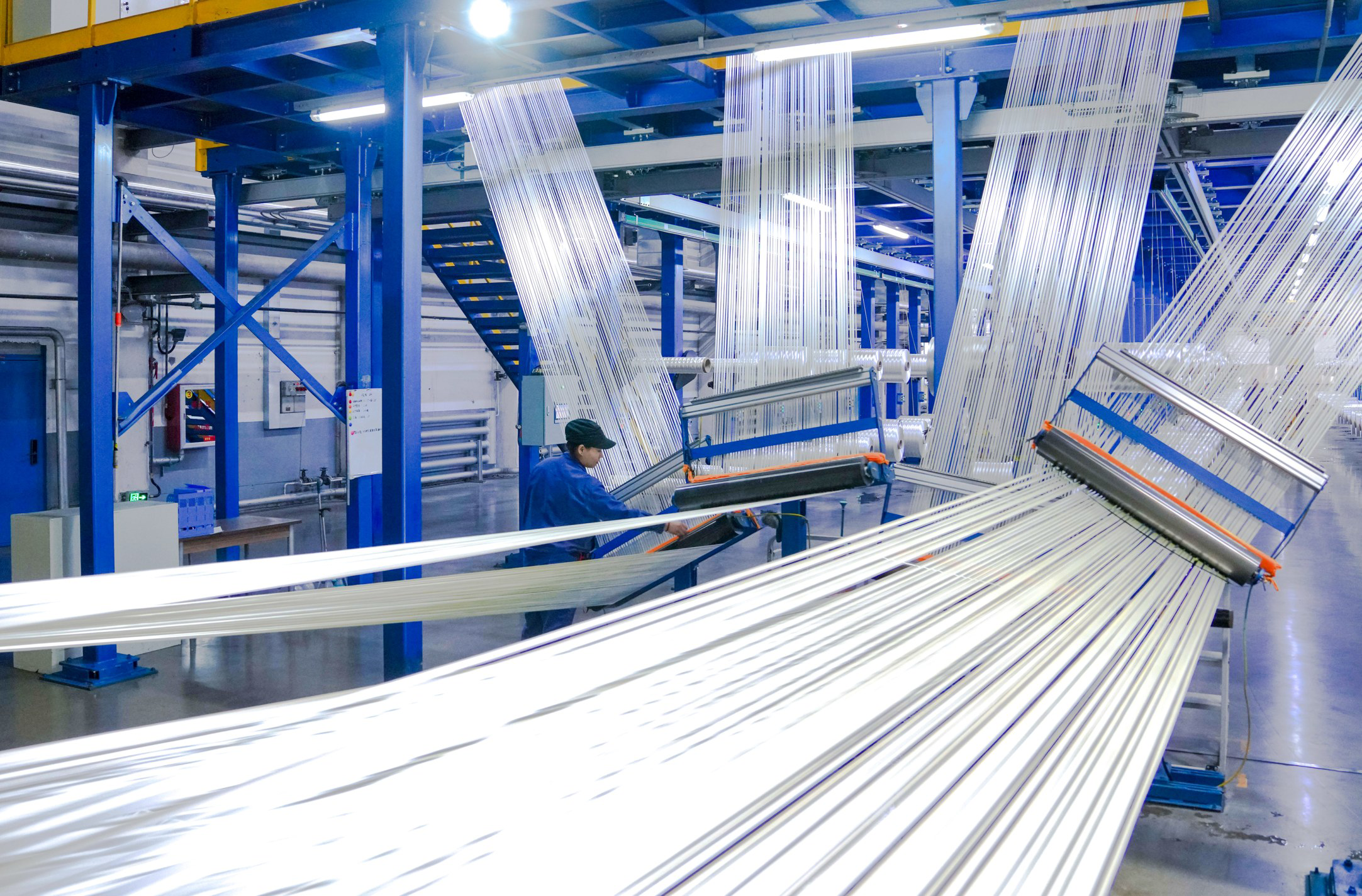 在吉林化纤集团有限责任公司碳纤维生产车间,智能自动化生产线正满负荷运转,一束束白色的碳纤维原丝经过氧化、碳化等工序后,变身为黑色碳丝,成为轻量化、高强度碳纤维滑雪板的原材料。